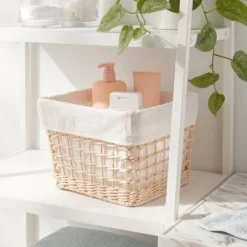 Accent your bathroom or powder room while keeping items neat and organized with this Large Tapered Woven Basket with Liner from Brightroomâ„¢. This tapered square-shaped basket brings handy storage to your bathspace. It features a hand-woven construction made from paper and rope for a natural, elegant look that complements any decor. This multipurpose basket is great for storing hand towels, makeup articles, bathroom essentials, and other daily items, and it comes with a white fabric liner that is removable and washable.