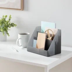 If you’re looking for a practical and eye-catching way to keep your workstation organized, look no further than this Medium Plastic Desktop Organizer from Brightroomâ„¢. This desktop organizer features three rows with five total compartments to provide you with loads of space to store your notebooks, planners, pens, small office appliances, and much more. The rows are set at ascending heights to add visual interest while making it easy to see all of your items at once, and the organizer is designed in various shades of gray that darken as you move down the frame for cool, creative style.